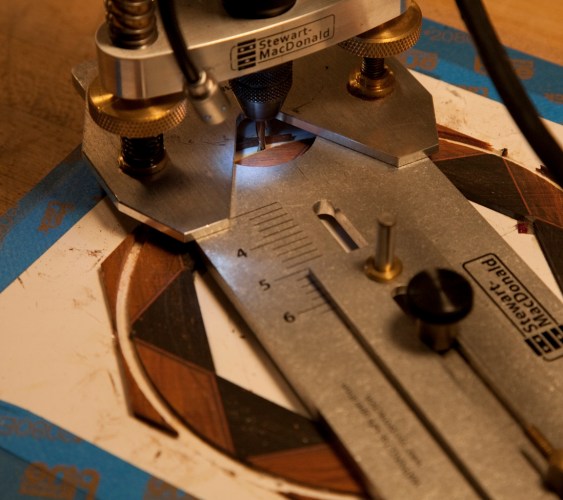 A router base with circle cutter attachment is used to cut the rosette out. This is done with many passes till the paper is reached. Don’t cut through the paper. On the outside of the circle move the cutter clockwiset. On the inside of the circle rotate the cutter counterclockwise.