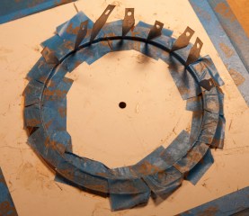 Two srtips of fiber binding to match the pieces between the cocobolo and ebony are glued around the inside. This is decorative and also helps to keep the rosette together. The strips are held in place with tape and Exacto blades while drying.