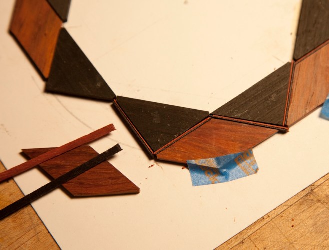 At this step two pieces if fibre ar cut that will create a separatioin line between the ebony and Cocobolo 32 pieces required