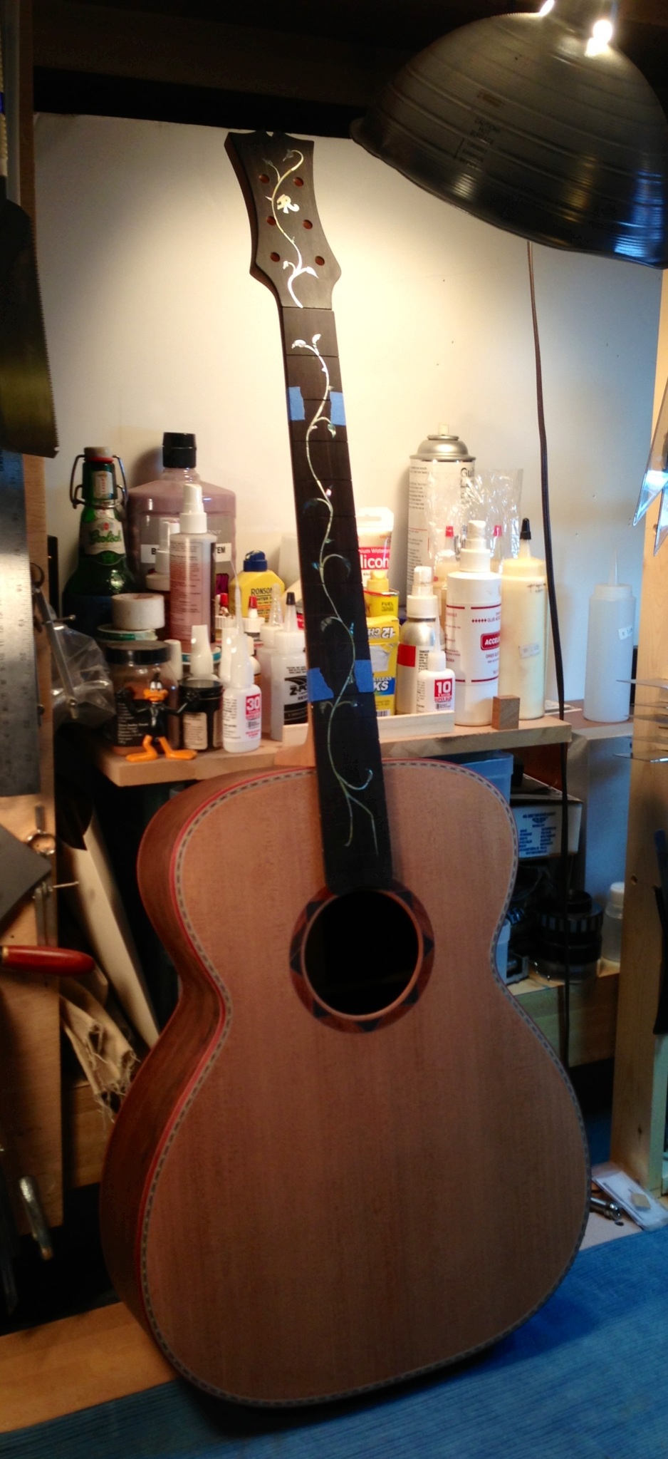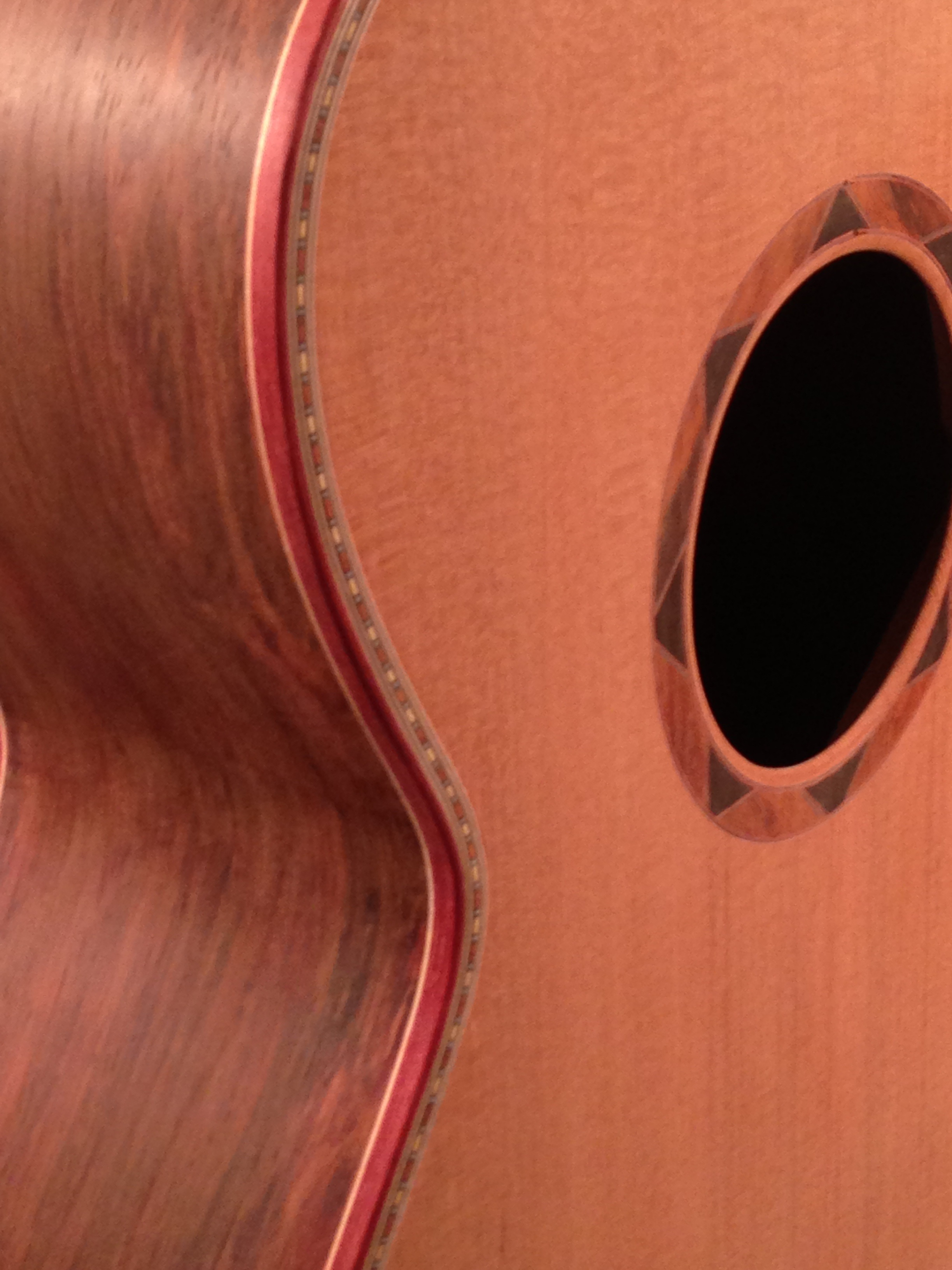 Well I have completed the binding on this acoustic. Although I planned on using a cocobolo binding, it turned out that there was not enough of a contrast between the binding and the body. Also I was not pleased with the quality of the material I received from my supplier and sent it back. I ended up using a bloodwood binding with a maple laminate. Today I fit the neck to the body. It was a nice fit and required very little adjusting to get it in line and at a proper angle to the body. Taking my time when cutting the tenon and angle there saved me lots of work in the final fit. Next it’s on to the fret work, nut and making the bridge.