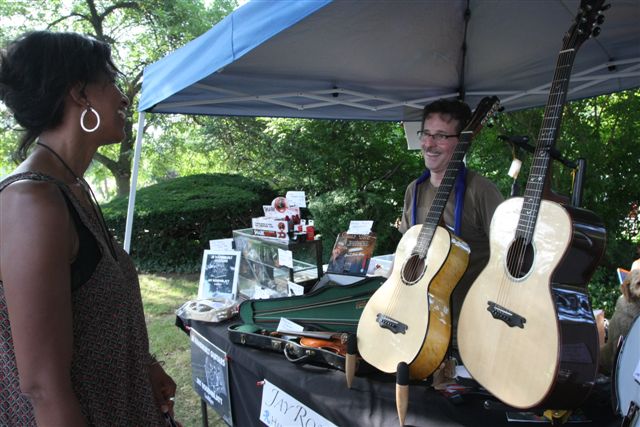 My tent was slightly rained out on for an hour Saturday, but Sunday, although hot, was dry. The tent looked great and because I was under a tree in the shade many people hung around. It didn’t hurt to be under the tree on Saturday either when it rained as it kept people around helping sales too. I received many inquiries about repairs and requests to commission me to build acoustic guitars.
