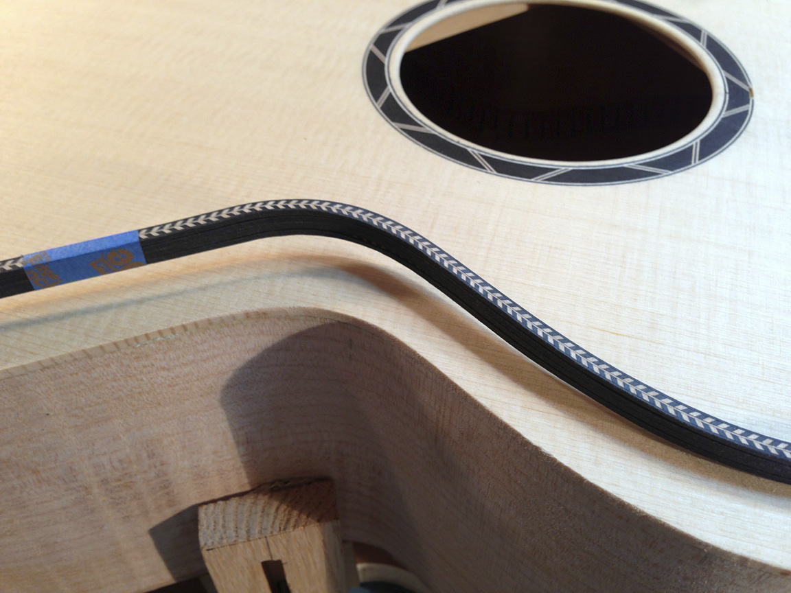 The body of the maple guitar will get some herringbone binding. The overall look of this instrument will be black and white.