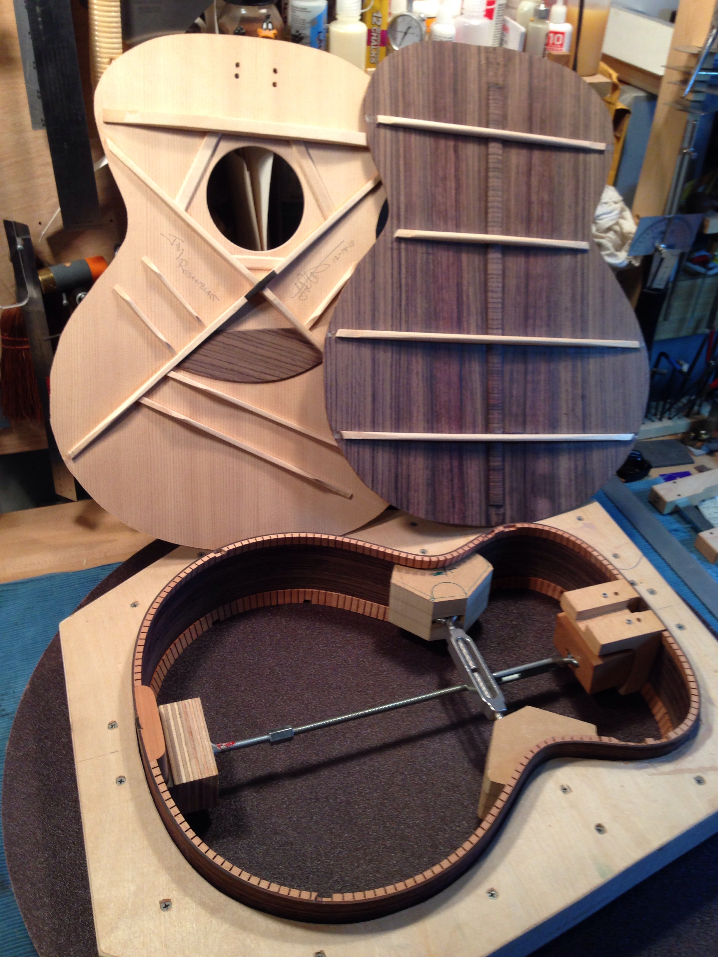 Top, back and sides ready to be assembled in this East Indian Rosewood guitar by Jay Rosenblatt. © Jay Rosenblatt Photo