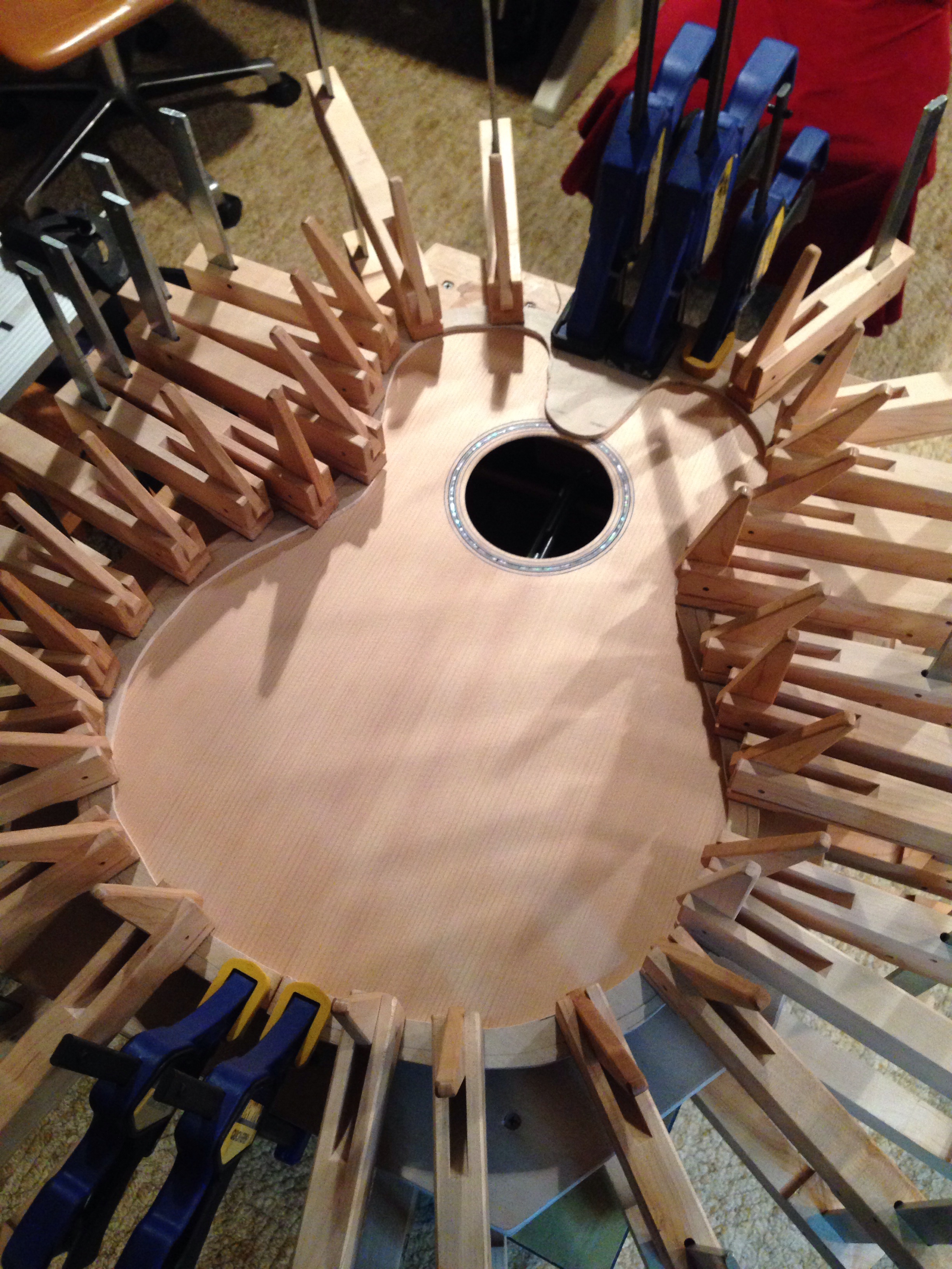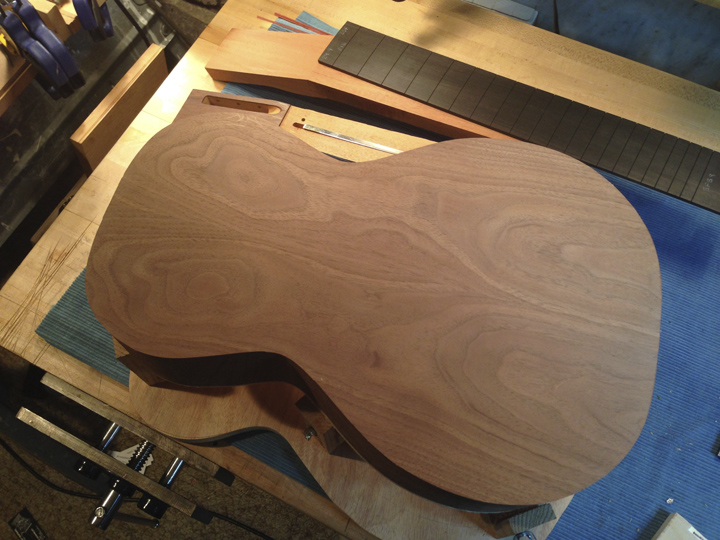 These photos show it in a test assembly for preliminary setup and is now being spray finished by my good friend and luthier, Tony DiDomenico. This should be completed early 2014.