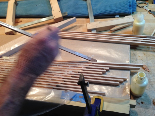 In preparation for the binding, traditional rope binding is made by laminating (here) strips of maple and mahogany together. These will be sliced diagonally into thin strips which will be installed as binding around the instrument and around the fingerboard and headstock.
