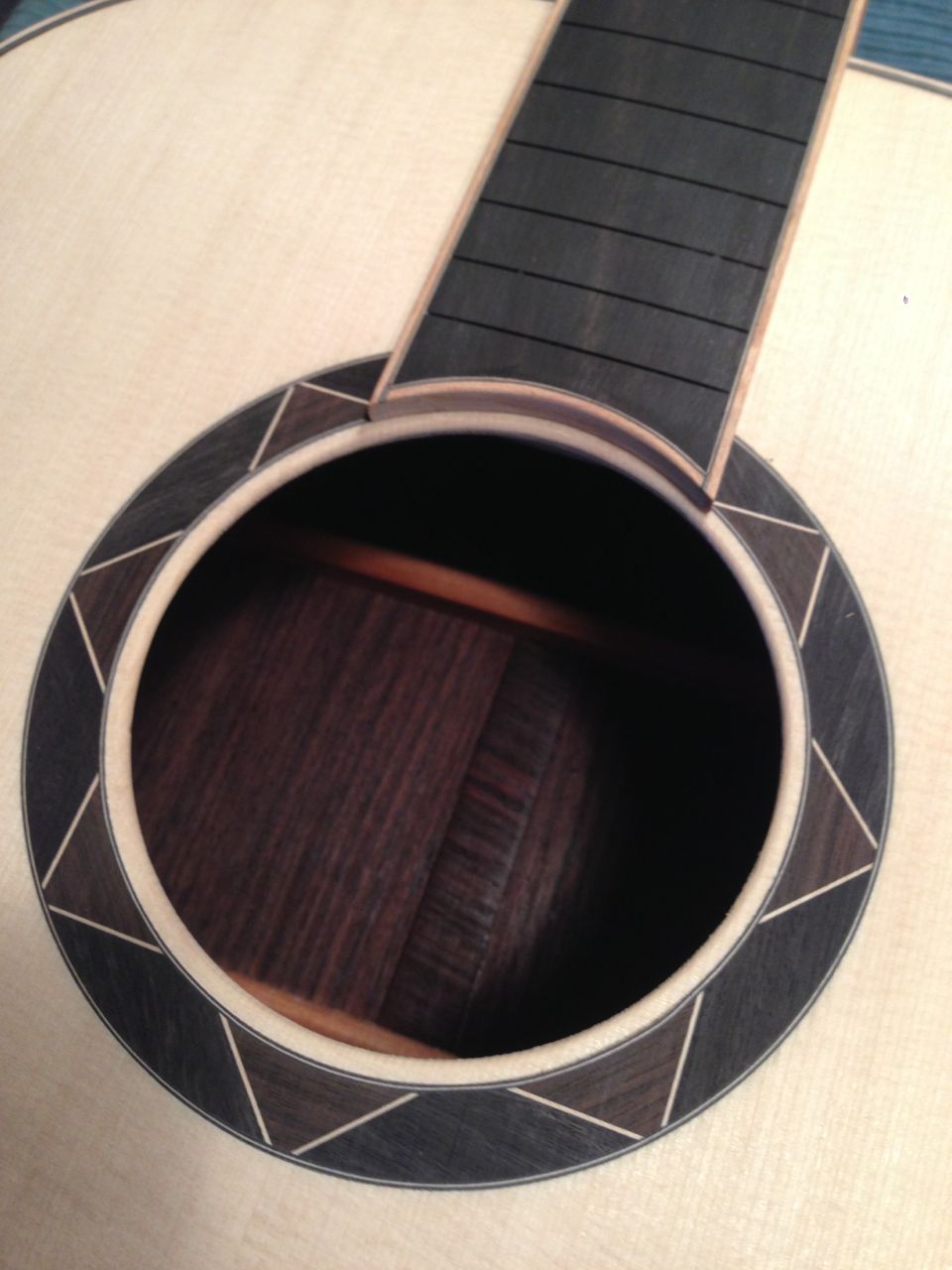 Maple bound Ebony fingerboard with Ebony and Maple Geometric Rosette on a Jay Rosenblatt guitar in process