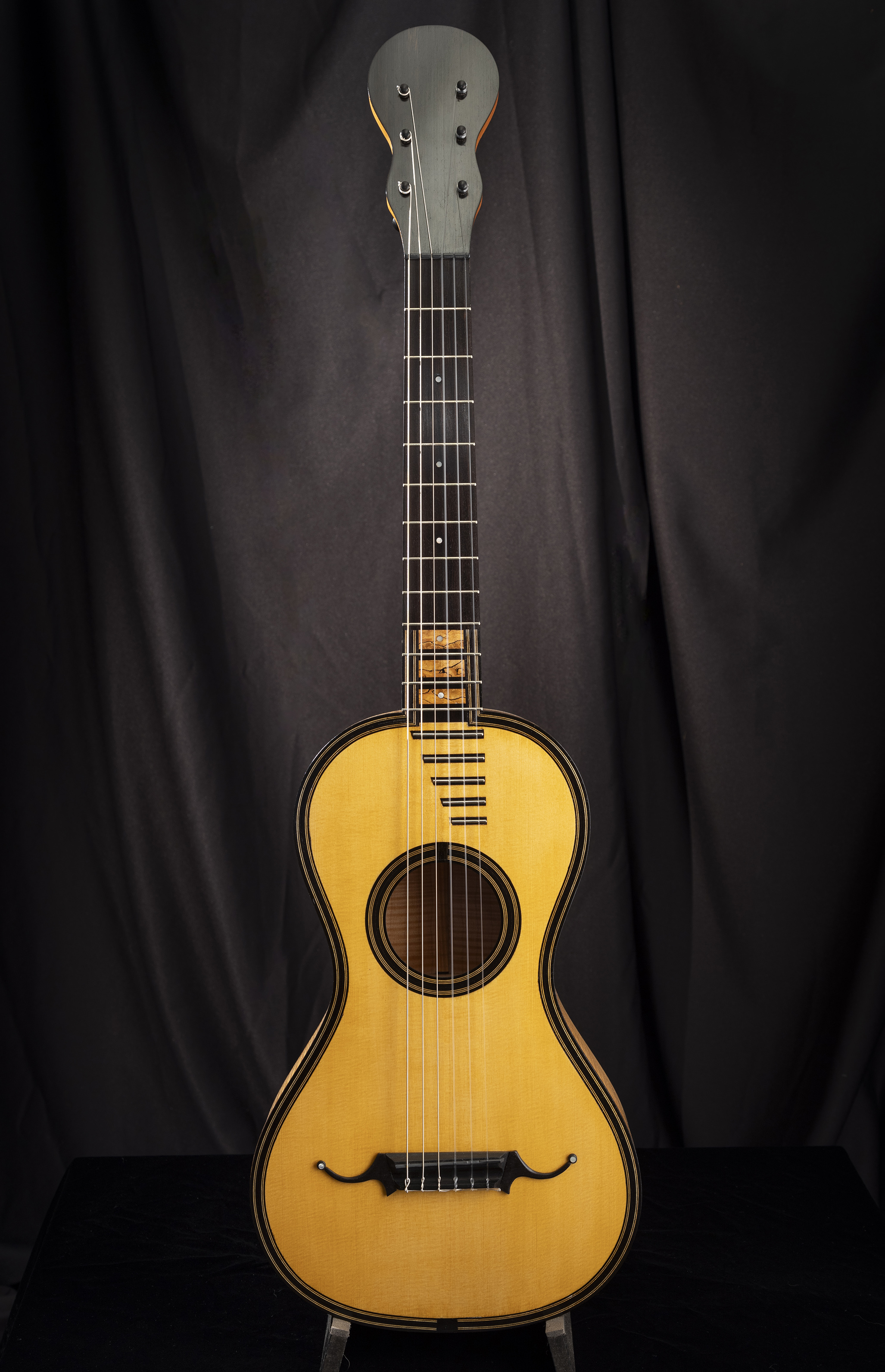 This guitar is modeled off an original Italian built instrument, c1780. Modern improvements have been added to this guitar. The measurements are the same as the original in all respects. The woods used are a match to the era of instruments, Spruce soundboard, Maple back and sides, Mahogany neck, with ebony appointments. The fingerboard is ebony mounted flush to the body as was typical of guitars of the time and the extended frets are inlaid into ebony canoes in the fingerboard for precision and strength. The instrument is modernized with carbon fiber stiffeners in the neck and the heel. The tuners are geared Peg-Heads. It has a modern tusk nut and saddle, Mother-of-Pearl position markers with inlaid burl fingerboard designs. Finished with French polish.
